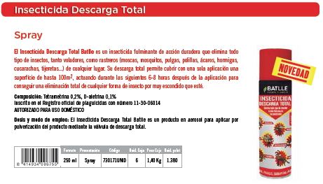 Insecticida fulminante de acción duradera que elimina todo tipo de insectos, tanto voladores, como rastreros (moscas, mosquitos, pulgas, polillas, ácaros, hormigas, cucarachas, tijeretas…) de cualquier lugar. Formato: Spray aerosol de 250 ml.