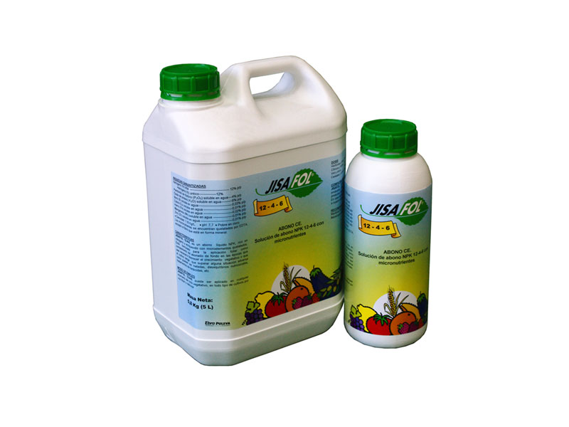JISAFOL 12-4-6 es un abono líquido NPK rico en nitrógeno y enriquecido con microelementos quelatados. Está formulado para la aplicación foliar como complemento del abonado de fondo, en las épocas que sea necesario favorecer el crecimiento vegetativo o que el cultivo tenga que superar alguna situación adversa como pueden ser heladas, desequilibrios nutricionales, tratamientos de herbicidas, etc.